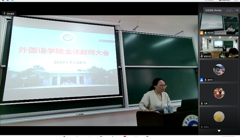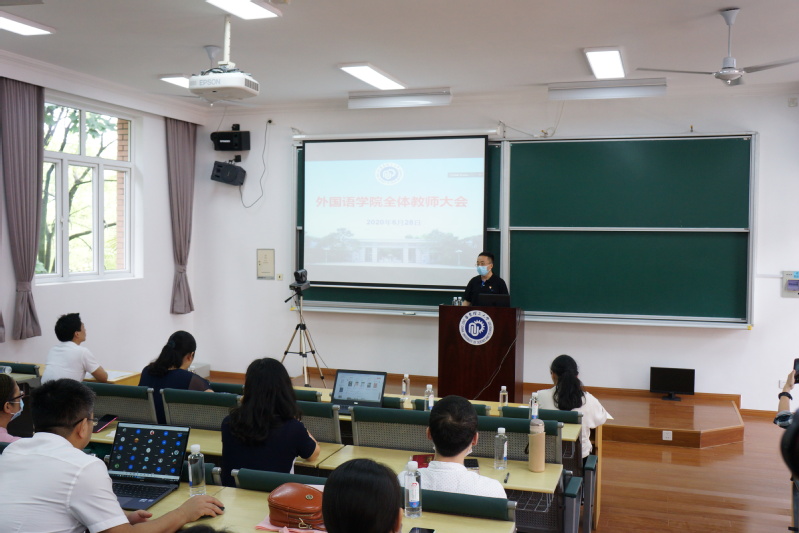 随后,学院召开学院全体教师大会,对本学期的工作进行总结,并部署下个学期的工作。王喆强调,要继续做好疫情防控工作,并按照学校要求做好期末考试工作、下学期的线上教学工作以及暑假期间的安全工作等。副院长吴建伟对本年度学院课程建设立项工作进行了布置。樊俊对毕业生就业工作进行了通报。