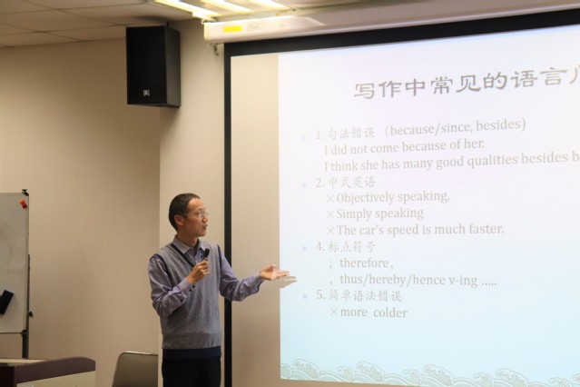 颁奖仪式结束后,副院长韦晓保为在座学生做了一场题为“英语写作技巧及常见错误分析”的讲座。韦晓保是认知神经语言学实验室主任、教育部教材评审专家和国内外多家外语类核心刊物匿名评审专家。在讲座中,他凭借多年来对英语的文本研究,总结了中国英语学习者在写作中常犯的错误,例如句法错误、中式英语、标点误用、句子结构不平行、口语化的用词、过量简单句等问题。他运用提供错句、要求改进的形式,让学生在互动中提高了对这类错误的认知,敦促他们在将来的写作中避免。同时,他还为学术英语写作总结了六句要诀,即“单词不如短语好、肯定不如双否好、陈述不如倒装妙、主动不如被动巧、分词结构不能少、并列不如复合好”。